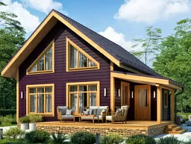 Дом создан из профилированного бруса размерами 6,75*7,85 общей площадью 44,52 м2. Широкое крыльцо (0,9*3,45) с деревянными ступеньками без перил ведет к центральному входу. Дверь предусмотрена трехстворчатая с зеркальной поверхностью. Удачный проект дачного дома (фото).