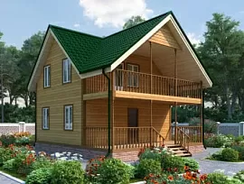Проект «Березки» – просторный двухэтажный коттедж площадью 134,5 м2, который идеально подойдет для загородного отдыха (проекты каркасных домов для зимнего проживания). Здесь достаточно свободного места, чтобы Вы могли пригласить в гости компанию друзей.Вход в дом организован через небольшую закрытую веранду. Здесь можно разместить мягкую мебель и небольшой столик, создав дополнительную зону отдыха. Дверь из веранды ведет в холл, а уже оттуда Вы можете попасть в гостиную, спальню, кухню, душевую и санузел. В просторной гостиной (21 м2) есть два двустворчатых окна, поэтому в комнате будет достаточно светло до самого вечера. Площадь кухни небольшая – 12 м2, но этого вполне достаточно для установки необходимой мебели и даже компактной обеденной группы. Рядом расположена уютная спальня (9 м2) с одним окном.