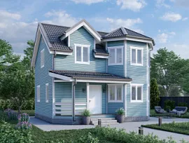 Дом 7,0*7,0 с полезной площадью в 86,5 м2. Дом имеет небольшую башенку и приглашающее крылечко с резными балясинами и перилами. Внутри нас встречает небольшой холл (6 м2) плавно перетекающий во второй этаж. Под лестницей расположился вместительный гардероб (3 м2).