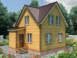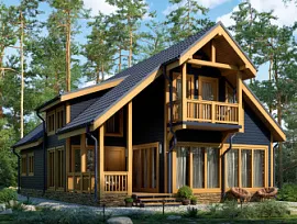 Классическая двускатная кровля, где в качестве материала используются кровельные гофрированные листы, имеет удлиненное исполнение. Благодаря этому первый этаж имеет крыльцо, а второй – удобные балконы, позволяющие наслаждаться красивым видом из окна. Габариты домостроения – 8х9 метров, что дает общую площадь в 124 м2.