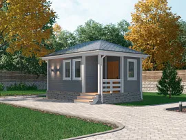 Площадь первого этажа составляет 54,3 м2. Здесь расположилась светлая гостиная (16,4 м2) совмещенная с кухней (5,8 м2). Из просторного холла можно попасть в предбанник, совмещенный с душевой и парной. Из дома можно попасть на уютную террасу, огражденную перилами с точеными деревянными балясинами.