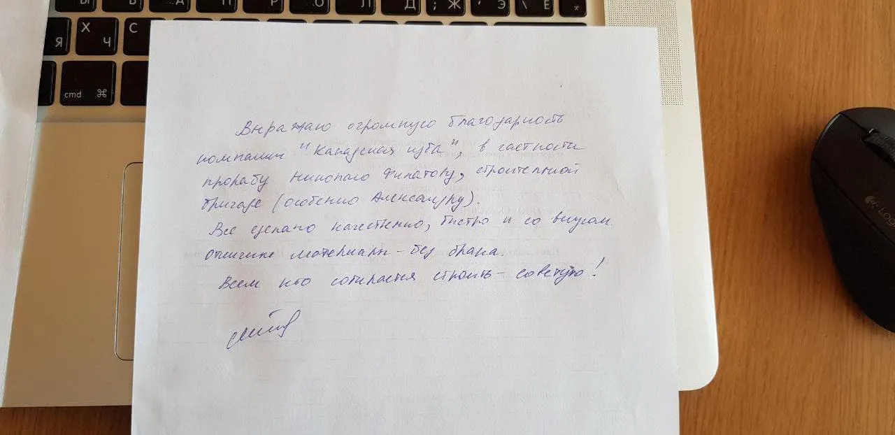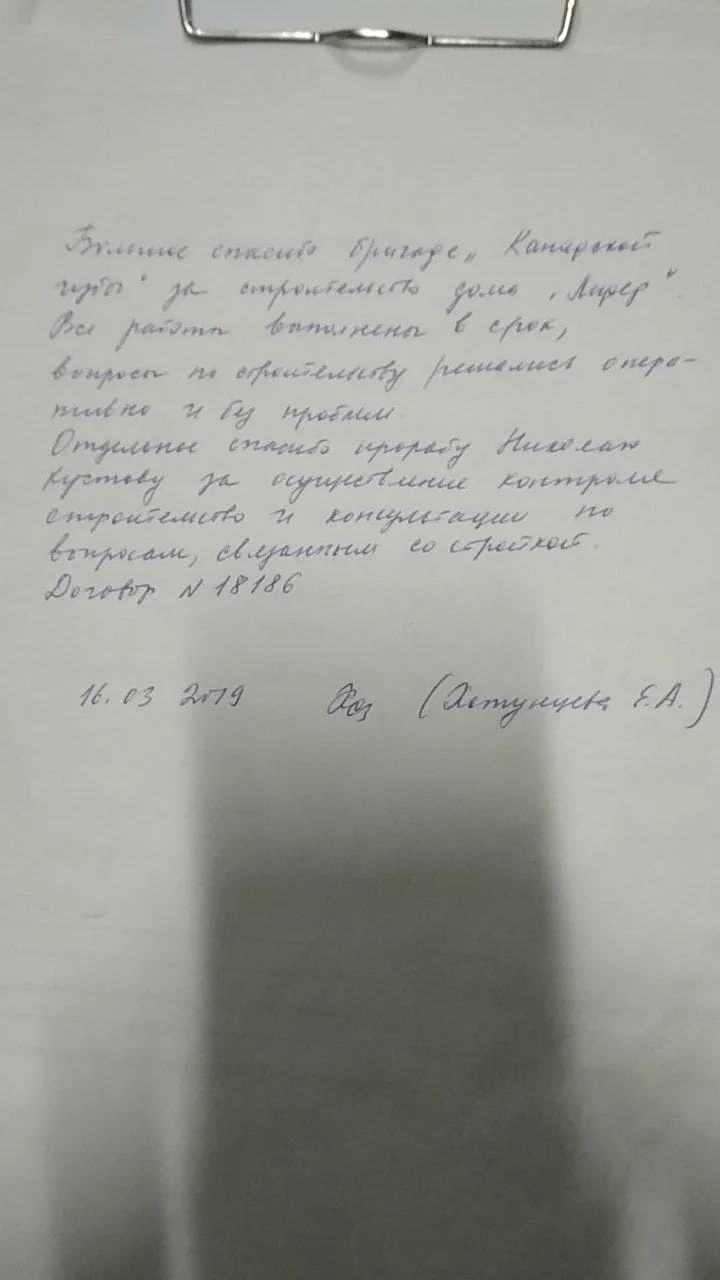 Отдельное спасибо прорабу Николаю Кустову за осуществление контроля строительства и коммуникации по вопросам, связанным со стройкой.
