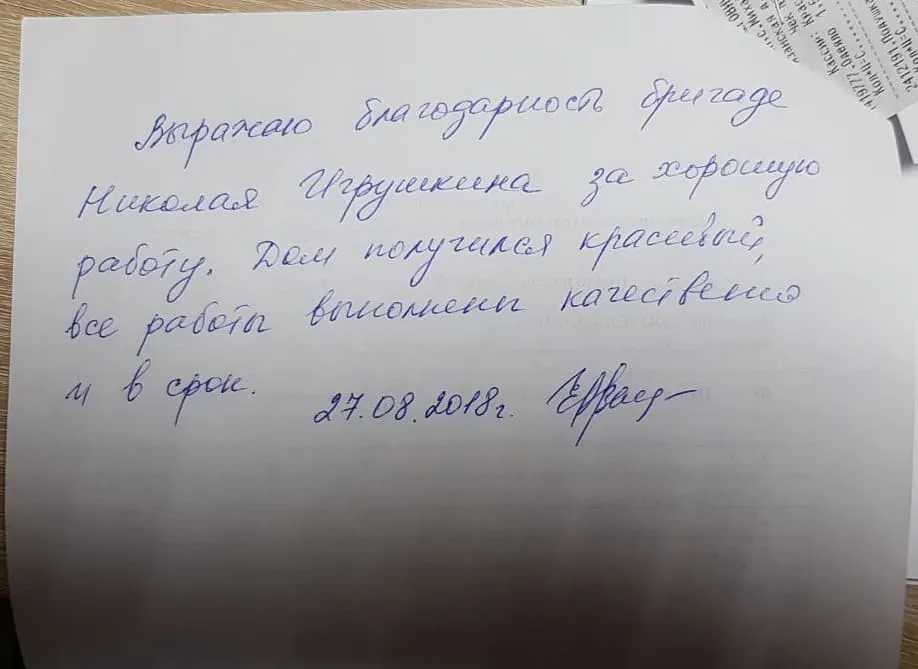 Выражаю благодарность бригаде Николая Игрушкина за хорошую работу, дом получился красивый, все работы выполнены качественно и в срок.