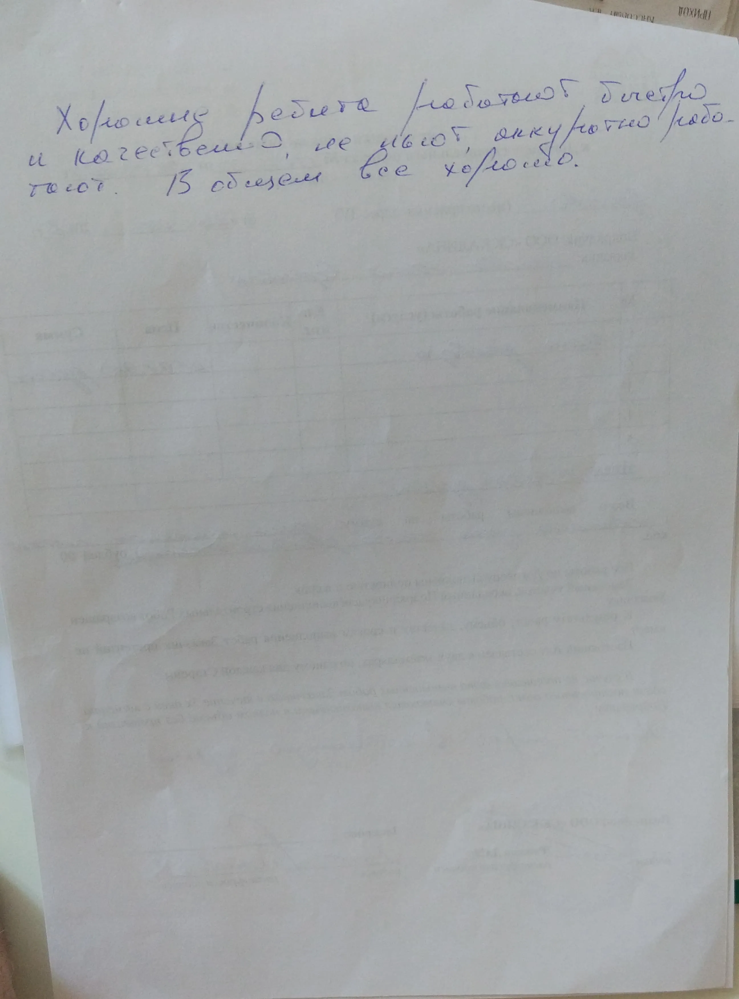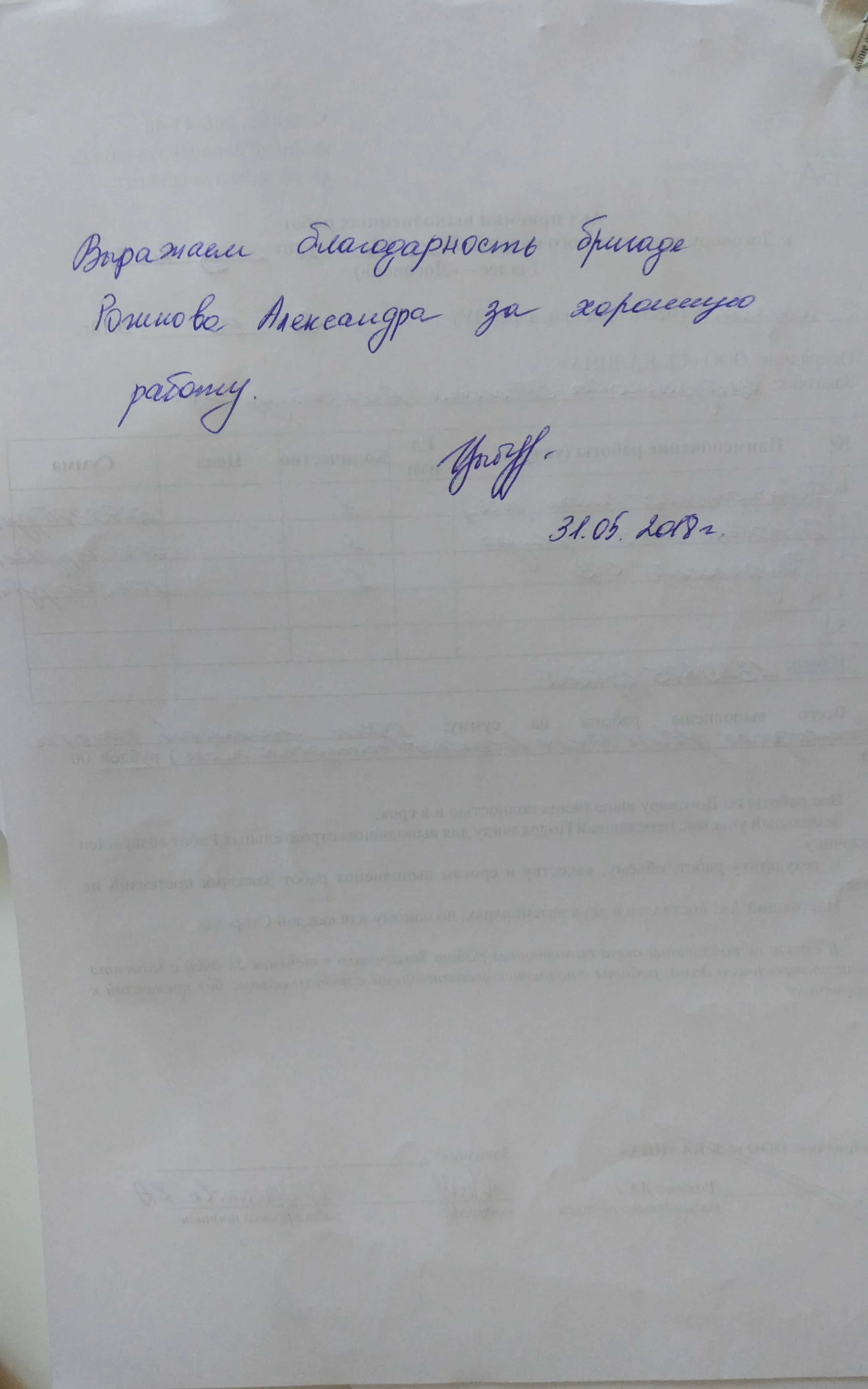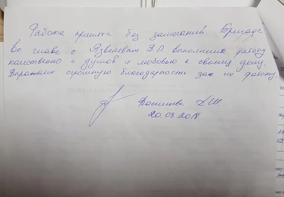 Работа принята без замечаний. Бригада во главе с Язвигевым З.П. выполнила работу качественно с душой и любовью к своему делу. Выражаем огромную благодарность за их работу.