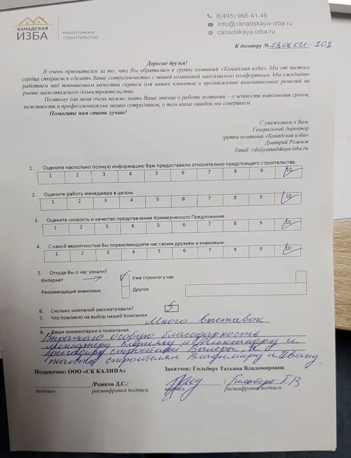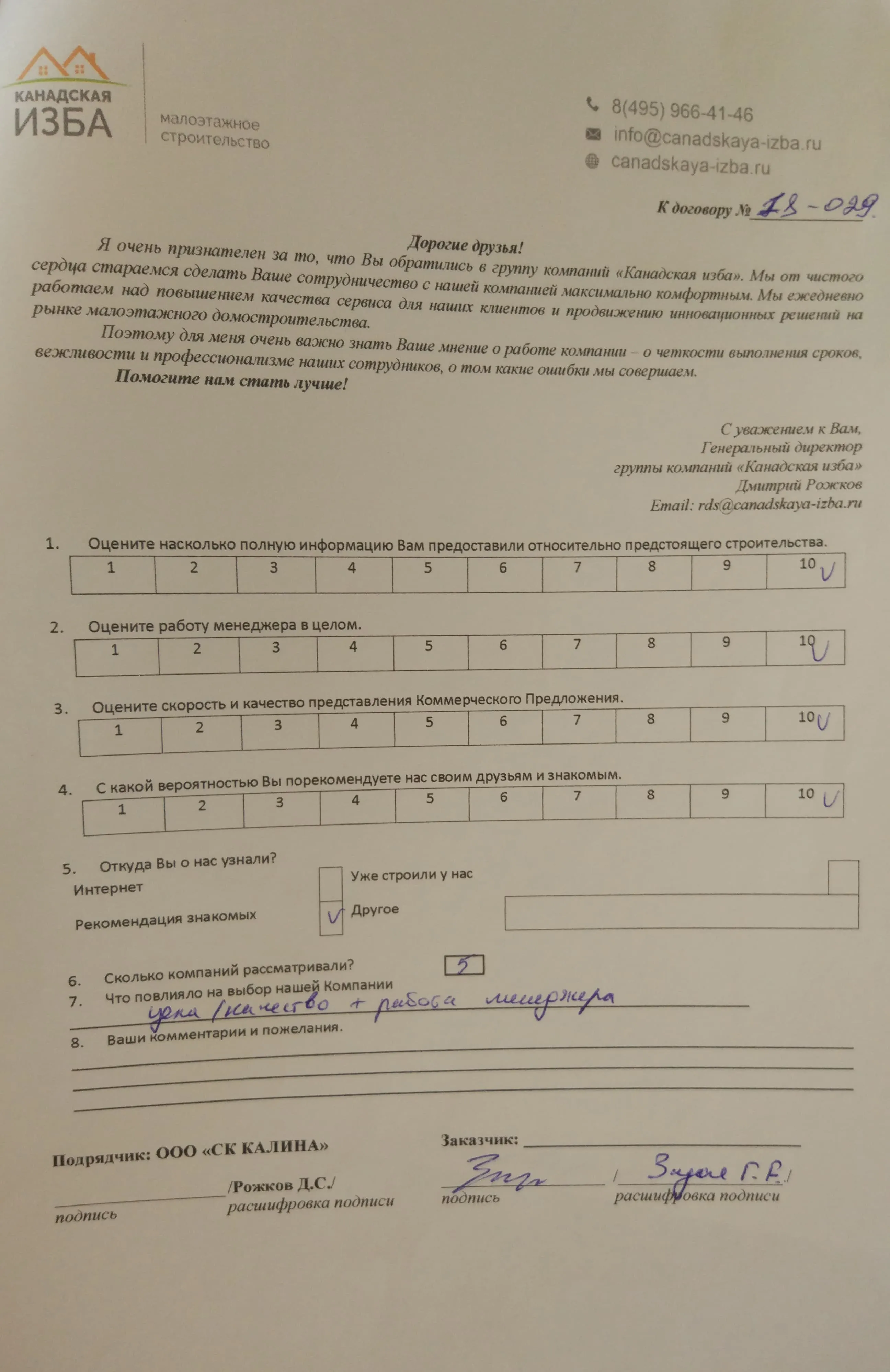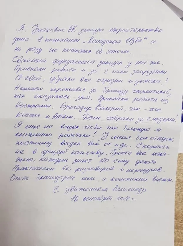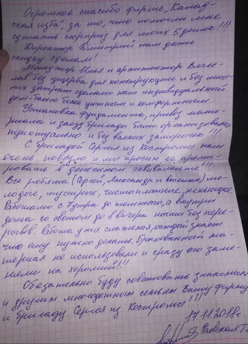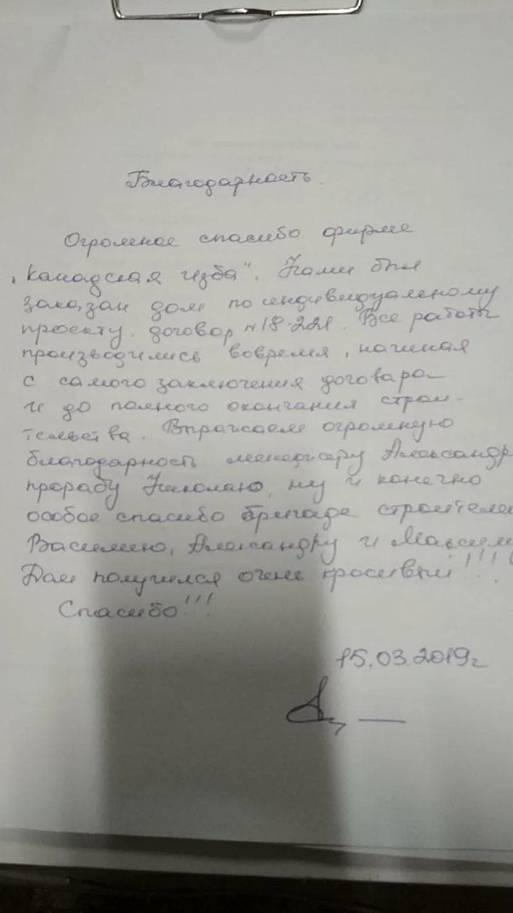 Огромное спасибо фирме «Канадская Изба». Нами был заказан дом по индивидуальному проекту, договор 18-221. Все работы производились вовремя, начиная с самого заключения договора и до полного окончания строительства. Выражаем огромную благодарность менеджеру Александру, прорабу Николаю, ну и конечно особое спасибо бригаде строителей Василию, Александру и Максиму.