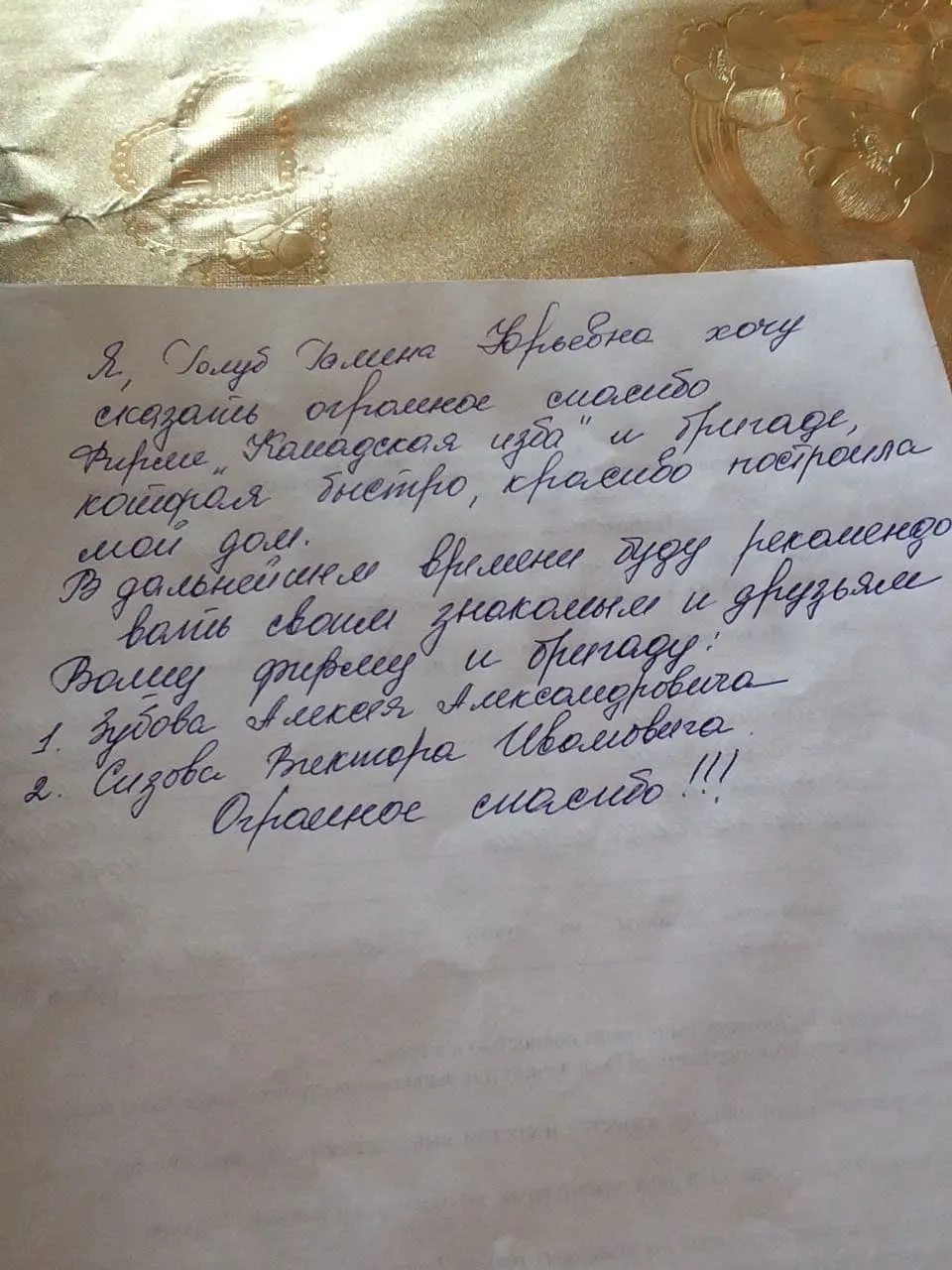 Выражаю огромную благодарность компании «Канадская изба», в частности прорабу Николаю Филатову, строительной бригаде (особенно Александру).